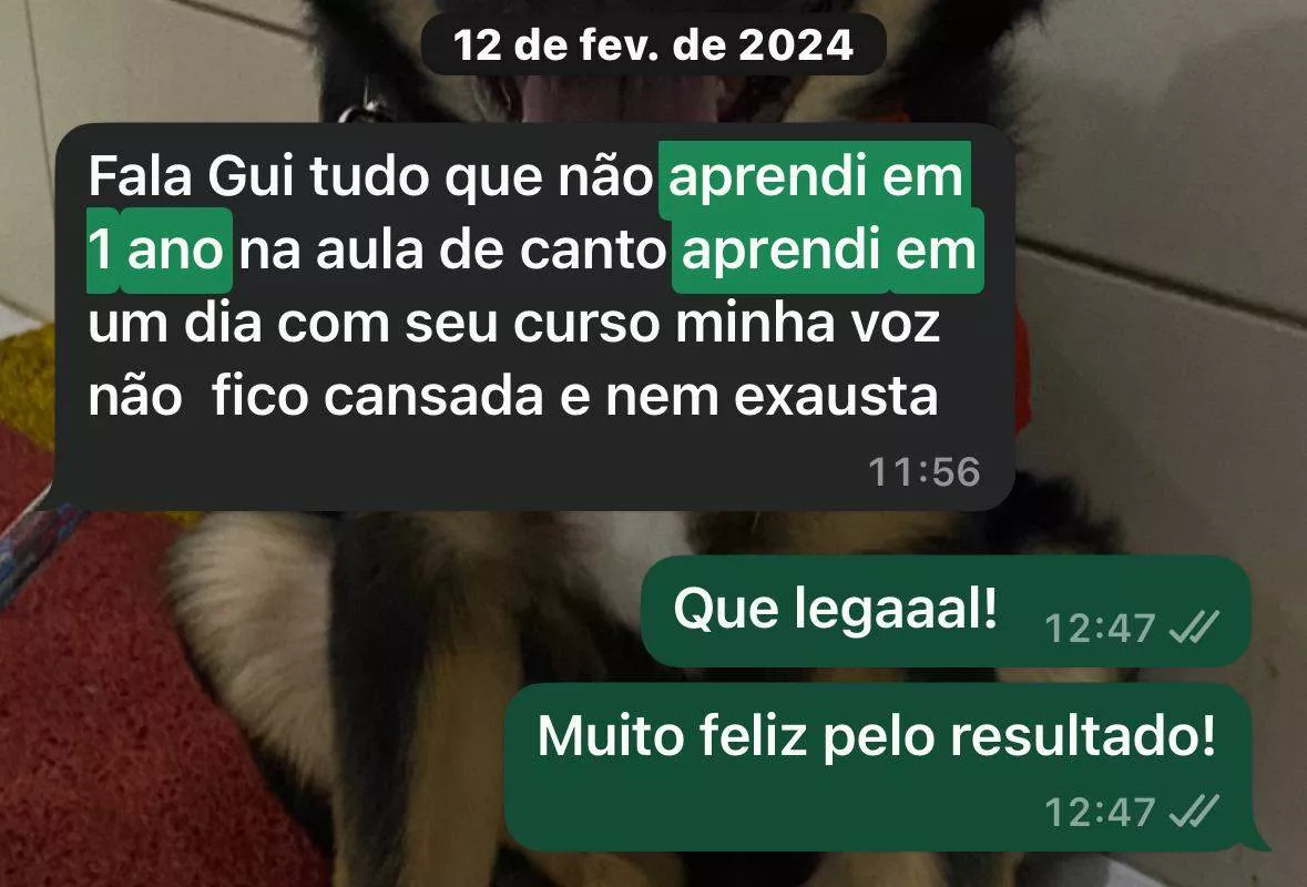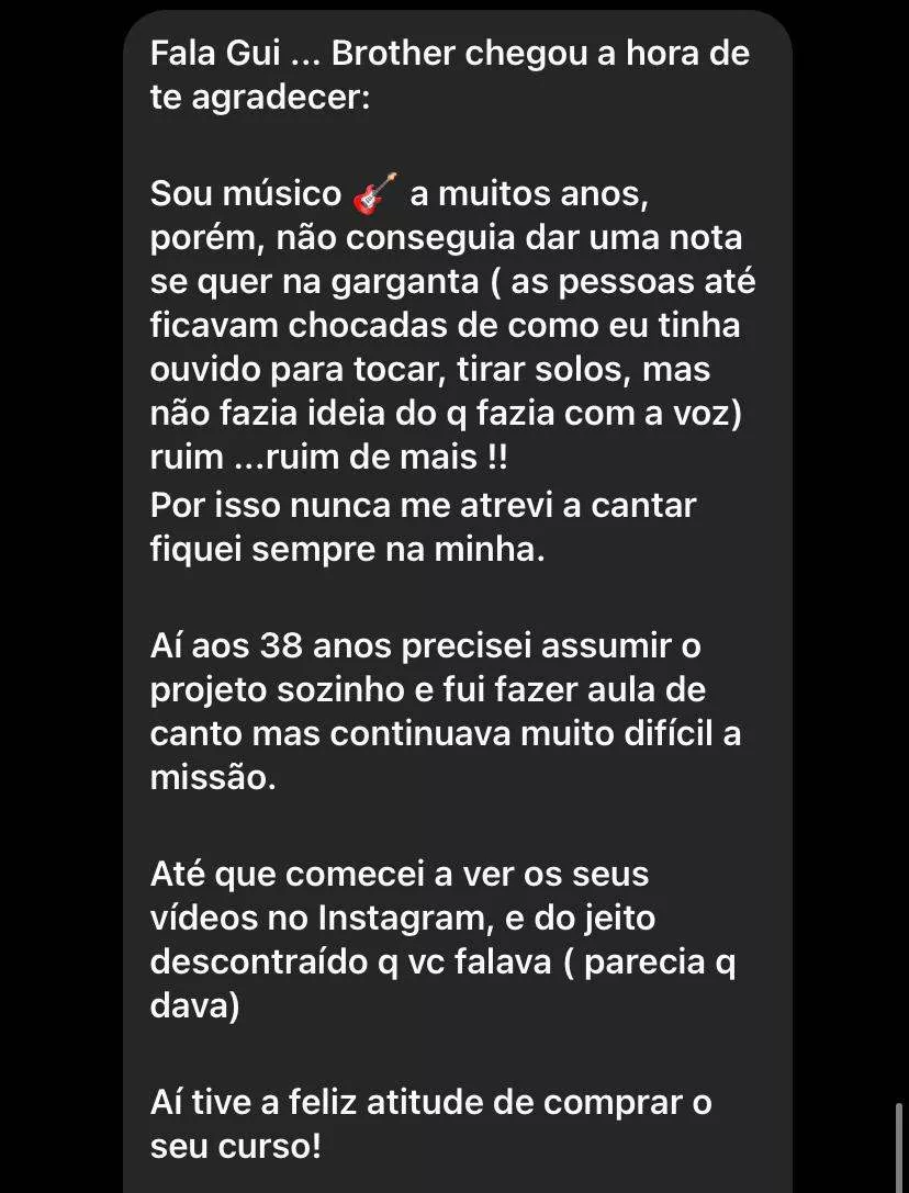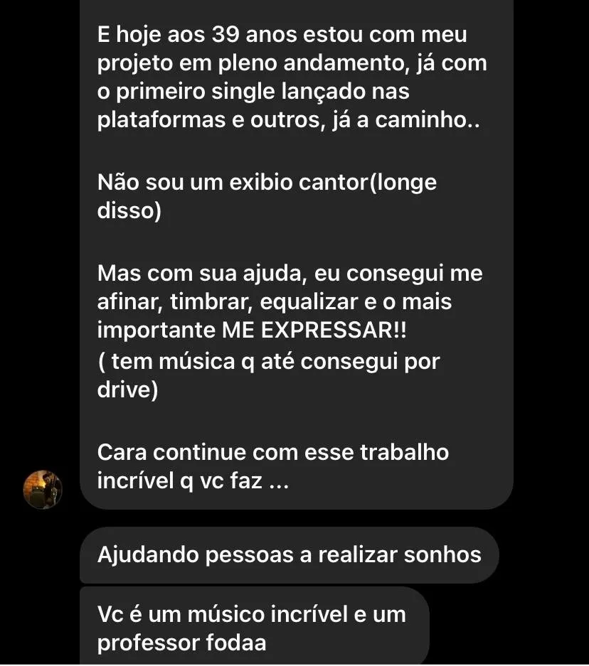 "Eu aprendi coisas que eu não tinha aprendido a minha vida inteira, que eu fiz aula em canto coral, em escolas de canto conservatoria musicais. Dicas que facilitaram muito a maneira como eu canto, desde aquecimento de voz, até extensão vocal, saber usar a voz da máscara e até entender da onde sai minha voz e pra onde eu tenho que levar. Cantar com mais potencia que é uma coisa que eu tinha bastante dificuldade. É impressionante como que em uma aula voce consegue sentir o quanto a sua voz evolui. Voce consegue sentir e perceber sua melhor e sua evolução na hora de cantar. Um método de ensino super diferenciado, super fácil e super acessível. Então, indico muito!"